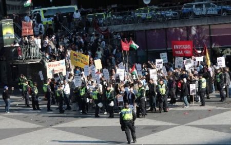 İsrail'i protesto eden grubun çevresine koruma çemberi kuran İsveç polisi adeta etten duvar ördü. İranlı grupları durdurmak için ise atlı askerler ve çok sayıda yaya polis görev aldı.