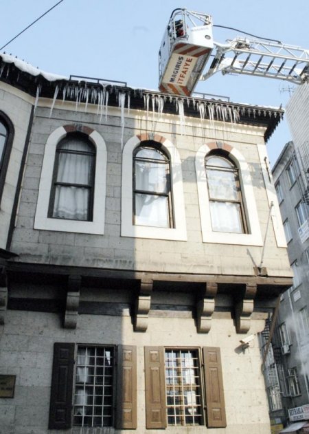 Geçen hafta Cuma günü etkili olan kar yağışı Pazar günü itibarıyla yerini açık ama soğuk havaya bıraktı. Gündüz güneşin etkisiyle çatıda eriyen karlar akşam saatlerine doğru çatı saçaklarında buz kitleleri oluşturuyor. Bir metre uzunluğa kadar ulaşan buz kitleleri ise tehlike oluşturmaya başladı. İtfaiye ekipleri, sabahın erken saatlerinde buz kitleleri düşmeden önce kırmak için harekete geçiyor. Merdivenli araçla çatı saçaklarına ulaşan itfaiyeci, kürekle buzları düşürüyor. Atatürk Evi Müzesi’nin çatı saçaklarında oluşan bir metreyi bulan buz kitleleri kısa süren çalışma sonrası düşürüldü. İtfaiye ekipleri, özellikle kamu binaları yoğunlukta olmak üzere günlük 5 kadar binanın çatı saçaklarından sarkan buzu kırdıklarını belirtti. 6 kişilik ekip, gün içerisinde gelen taleplere göre artırılıyor.