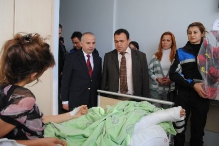 Hakkari'de terör örgütü yandaşlarının izinsiz gösterisinde yoldan geçtiği sırada gaz bombasının ayağına isabet etmesi sonucu yaralanan 17 yaşındaki Kezban Erol'u il emniyet amirleri ziyaret etti.