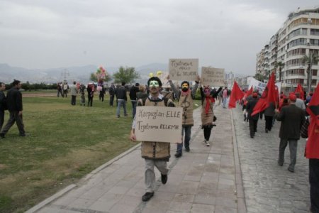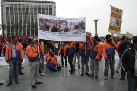 DİSK Ege Bölge Temsilcisi Ali Çeltek ise sorunun sadece ekonomi alanında yaşanmadığını ve hukukun sorgulandığı bir süreç yaşandığını söyledi. Çeltek, Türk işçi sınıfının sorunlarla boğuştuğunu, bir yandan krizin yüküne, diğer yandan da yasak ve baskılara karşı direndiklerini ifade etti.