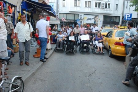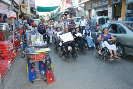 İzmir Gönüllü Engelliler Grubu, kaldırımların standart yapılmaması ve işyerleri tarafından işgal edilmesine tepki gösterdi. Kaldırım işgalleri yüzünden sokağa çıkamadıklarını belirten engelliler, mağduriyetlerinin giderilmesi amacıyla İzmir Kent Konseyi binasının önünde basın açıklaması yaptı.