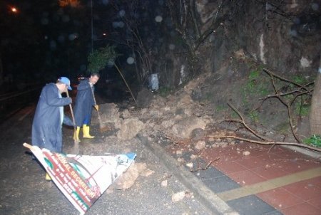 İzmir'in Konak ilçesinde gece boyunca etkili olan yağmur sebebiyle toprak kayması meydana geldi. Kaya parçaları yola savruldu.