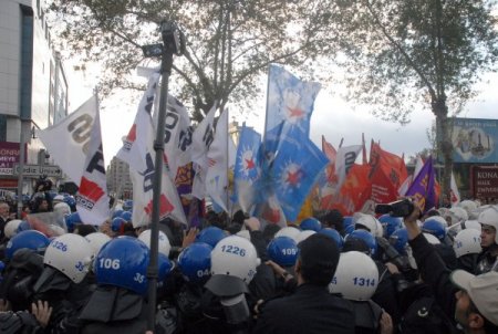 Bu sırada yaşanan arbedede eylemciler ellerindeki parti bayraklarının takılı olduğu sopalarla polise vururken, polis de eylemcilere biber gazı ile müdahale etti. Eylemciler biber gazından etkilenirken olayla ilgili 2 kişi gözaltına alındı. Yaşanan gerginliğin sona ermesinin ardından grup, yaklaşık 2,5 saat meydanda bekledi. Burada grup adına basın açıklaması yapan Coşkun Üsterci, polisin kendilerine yönelik tutumunu kınadıklarını söyledi.