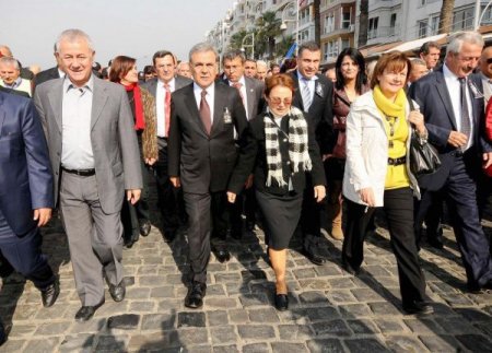 Yürüyüşe İzmir milletvekilleri Mustafa Moroğlu, Alaattin Yüksel, Hülya Güven, Aytun Çıray, Musa Çam ve Erdal Aksünger, Büyükşehir Belediye Başkanı Aziz Kocaoğlu, eşi Dr. Türkegül Kocaoğlu, Balçova Belediye Başkanı Mehmet Ali Çalkaya, Narlıdere Belediye Başkanı Abdül Batur, Bornova Belediye Başkanı Kamil Okyay Sındır, Karabağlar Belediye Başkanı Sıtkı Kürüm, Gaziemir Belediye Başkanı Halil İbrahim Şenol, Kemalpaşa Belediye Başkanı Rıdvan Karakayalı, İl Genel Meclisi Başkanı Serdar Değirmenci, CHP İl Başkanı Tacettin Bayır, İzmir Gazeteciler Cemiyeti Başkanı Atilla Sertel, sivil toplum kuruluşları, dernekler, üniversiteler ve kamu kurumu temsilcileriyle diğer vatandaşlar. Meydanda bir konuşma yapan Başkan Kocaoğlu, "Kahraman bir asker, yiğit bir halk önderi ve örnek bir devrimci, insanlık tarihinin unutulmazlarından, 'Ya istiklâl ya ölüm' parolasıyla ülkemizi ve milletimizi uçurumun kenarından kurtaran, kurtuluşumuzun ve kuruluşumuzun büyük mimarı Gazi Mustafa Kemal Atatürk'ü bir kez daha sevgi, saygı, özlem ve minnetle anıyoruz." dedi. CİHAN