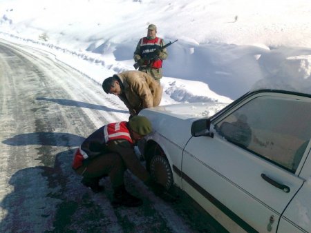 Tufanbeyli yolunda kar sebebiyle yolda kalan araçlara yardım eden jandarma ekipleri, mağdur durumda olan sürücülerin zincirlerini taktı. CİHAN
