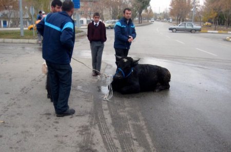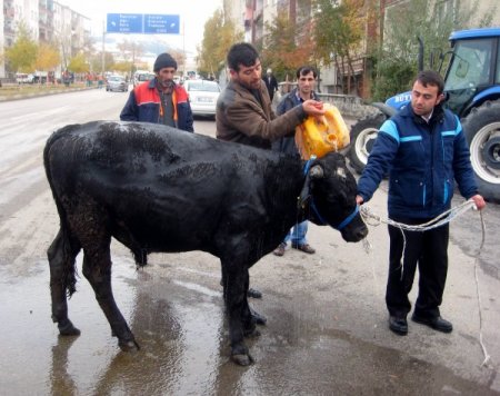 Erzurum merkez Yakutiye ilçesi Veyis Efendi Mahallesi'nde Metin Nur, 3 bin liraya satın aldığı kurbanlık boğayı evine götürürken elinden kaçırdı. Cep telefonundan Alo 153 Zabıta Hattı'nı arayarak yardım isteyen Nur'un imdadına belediyenin Kurban Timi yetişti. Olay yerine gelen tim, havalı tüfekle attığı uyuşturucu iğne ile kaçan hayvanı etkisiz hale getirdi. Yol ortasında baygınlık geçiren tosun iğnenin etkisinin uzun sürmesi üzerine, kurban timi elemanlarının talebiyle boğaya sirke ve su ile müdahale edildi. Üzerine dökülen soğuk suyun etkisiyle kurbanlık boğa ayağa kalktı. Tosun daha sonra kurban timinin marifetiyle yoldan çıkartılarak kaldırım kenarındaki demir korkuluklara bağlandı. Kurban timi yetkilileri, kaçan kurbanlığı iğne ile uyuşturduklarını söyledi. Kurbanın sahibi Nur ise hayvanın elinden kaçtığını ve yakalayabilmek için belediye kurban timinden yardım talebinde bulunduğunu ifade etti. CİHAN