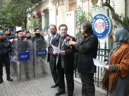 Mazlum-Der üyesi bir grup, Kaddafi’nin öldürülmesini protesto etmek için İstiklal Caddesi üzerinde bulunan Fransa’nın İstanbul Başkonsolosluğu önünde toplandı. Grup adına bir açıklama yapan Mazlum-Der İstanbul Şube Başkanı Cüneyt Sarıyaşar, BM’nin 1973 sayılı kararı ile Libya’yı uçuşa yasak bölge etmesinin hemen sonrasında karardan vazife çıkaran Sarkozy’nin, ABD de dâhil NATO ülkelerine haber vermeden yangından mal kaçırırcasına Libya’ya 7 ay sürecek saldırıları başlattığını söyledi. Kaddafi’nin sonunun başlangıcının, seçim kampanyasını yürütmek için kendisinden para dilenen Sarkozy eliyle başladığını öne süren Sarıyaşar, “Dünya’nın en acımasız diktatörlerinden biri olan Kaddafi’nin 42 yıllık kanlı iktidarının sonu, en zor zamanında ABD’nin kapıları yüzüne kapanan sadık hizmetkârı Şah’ın veya yıllarca ABD adına sipariş savaş yürüten ve ABD eliyle infaz edilen Saddam’ın ya da en zor zamanında Fransa’nın kapıları yüzüne kapanan sadık hizmetkârı Bin Ali’nin iktidarlarının sonundan farklı olmadı.” dedi.