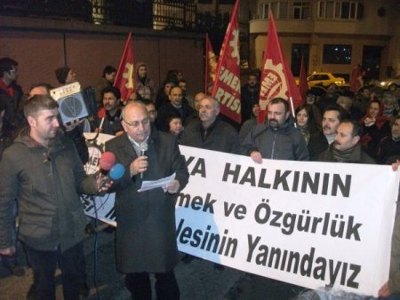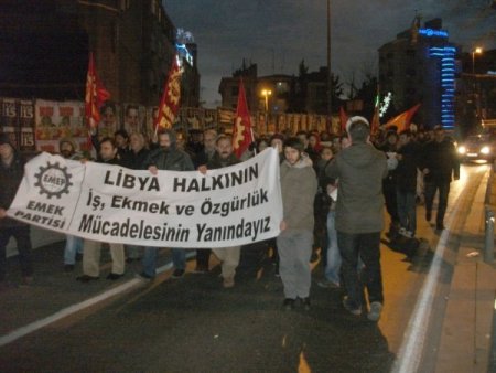 İstanbul Beyoğlu’nda Libya lideri Muammer Kaddafi’yi protesto eden Emek Partisi (EMEP) üyesi bir grup, Libya Başkonsolosluğu’na yürüdü. Taksim Meydanı’ndan Gümüşsuyu’ndaki konsolosluk önüne gelen grubun önü Çevik Kuvvet tarafından kesildi. Sokak girişinde basın açıklaması yapan grup, olaysız dağıldı. Emek Partisi üyesi yaklaşık yüz kişilik grup akşam saatlerinde Taksim Meydanı’nda toplandı. ‘Libya halkının iş, ekmek, özgürlük mücadelesinin yanındayız’ yazılı pankart açan grup, Gümüşsuyu’nda bulunan Libya’nın İstanbul Başkonsolosluğu binasına doğru yürüyüşe geçti. Yer yer yolları trafiğe kapatan grup yürüyüş boyunca ‘Libya halkı yalnız değildir’, ‘Katil ABD Ortadoğu'dan defol’, ‘Yaşasın halkların kardeşliği’, ‘Katiller halka hesap verecek’, ‘Özgür Libya özgür Afrika’, ‘Katil Kaddafi hesap verecek’ şeklinde sloganlar attı. Grubun önü konsolosluğa 50 metre kala Çevik Kuvvet ekiplerince kesildi. Çevik Kuvvet'in önünde bir basın açıklaması yapan Emek Partisi İstanbul İl Başkanı Güven Gerçek, Tunus ve Mısır halklarının diktatörleri alaşağı ederek, tüm Ortadoğu ve Kuzey Afrika ülkelerinde isyan ateşini yaktıklarını söyledi. Bahreyn, Yemen, Cezayir, Fas ile birlikte Libya halkının da diktatörlüğe karşı ayaklandığını belirten Gerçek, “Türkiye işçi sınıfı ve emekçileri adına, mazlum Arap halklarının devrimci başkaldırısını coşkuyla selamlıyoruz. Bugün buradan, kardeş Libya halkı ile enternasyonal dayanışma içinde olduğumuzu bir kez daha buradan ilan ediyoruz.” dedi.Libya halkının iş, ekmek ve özgürlük için kendi kendini yönetebilmeyi talep ettiğine vurgu yapan Gerçek şöyle konuştu: “Mazlum halkları kırk senedir süren ve babadan oğla geçen diktatörlüklerle artık yönetebilmek istemiyorlar. Libya diktatörlüğü en kısa zamanda ülke yönetimini halka devretmeli ve bugüne kadar yaptığı zulüm ve soygunun hesabını vermelidir. Kaddafi ve adamları yabancı işçileri rehin alma politikasından vazgeçmelidir. Libya’da kiralık katillerin halka kurşun sıkmasına son verilmelidir.”