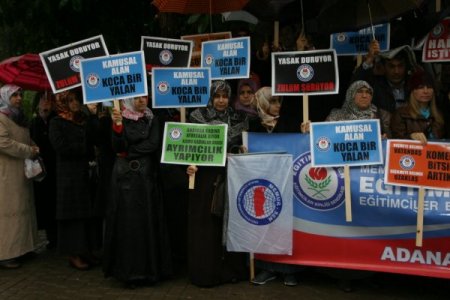 Adana'da, Eğitimciler Birliği Sendikası'na (Eğitim-Bir-Sen) üye bir grup, kamuya ait yerlerde çalışanlara başörtüsünün serbest olması için eylem yaptı.