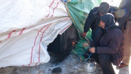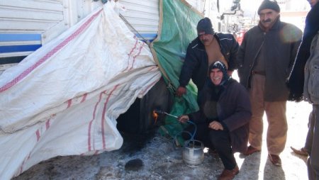 İl dışından gelen saman satıcıları, her gece mazot depolarının donmaması için ilginç biz çözüm buldu. Her gün araçların altını tüple ısıtmaktan bıkan satıcılar, donan yakıt depolarının etrafını çadır ve battaniyelerle örterek soğuktan korumaya çalıştı. Ancak şiddetli soğuklara karşı çadır ve battaniye de çözüm olmadı. Donan depolar yine piknik tüpüyle ısıtıldı.