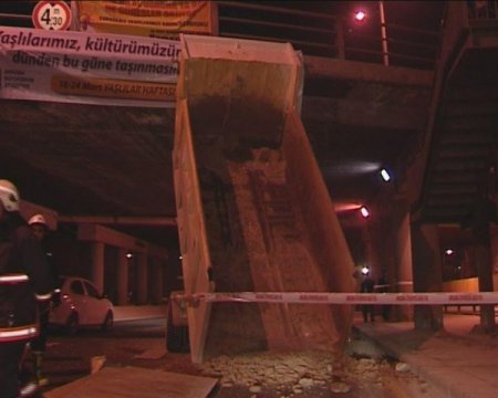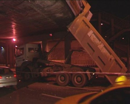 Ankara'da, havası boşalan damperin kalkması sebebiyle bir kamyon köprüye takıldı. Ne olduğunu anlayamayan ve hafif şekilde yaralanan kamyon şoförü şoka girdi.