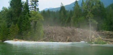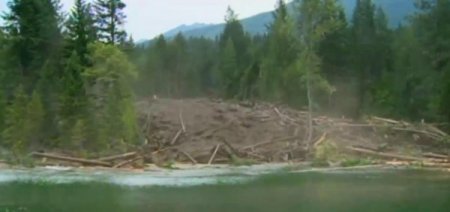 Olay, dün Johnsons Landing bölgesindeki kıyı şeridinde gerçekleşti. Global News televizyon kanalı ekibinin çekim yaptığı sırada ağaçların arkasından büyük bir çatırtı duyulmaya başlandı. Sahilde bulunan 2 kişi, yaklaşan heyelanın paniğiyle teknelerine atlayıp kıyıdan uzaklaşmaya çalıştı. Tam o sırada ağaçlar büyük bir gürültüyle devrildi. Dağdan gelmekte olan çamurlu toprak, üzerindeki ağaç gövdeleriyle birlikte suya akmaya başladı. Tekneye atlayıp kıyıdan uzaklaşmaya çalışan Kanadalı çift, büyük odunların altında kalmaktan son anda kurtuldu. Yaşananlar an be an görüntülendi.