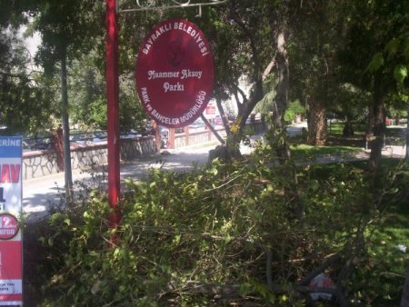 İzmir'in Bayraklı ilçesinde, belediye ait bir alandaki parkta kantin yapmak için çınar ağacını kestiler. Parçalarını da yolun karşı tarafındaki parkın içine koydular.