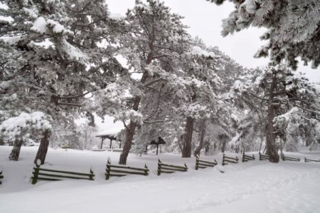 Yozgat'ta beyaz örtü henüz kalkmamışken dün başlayan ve gün boyu devam eden kar yağışı, Çamlık Milli Parkı'nda cezbedici görüntüler oluşturdu.