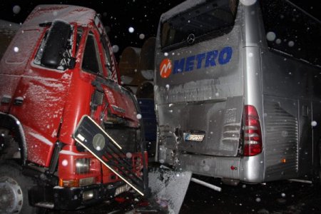 Karabük'te devam eden kar yağışı nedeniyle 3 TIR ile içersinde 54 yolcusu bulunan otobüs ve bir otomobilin karıştığı zincirleme kazada 2 kişi yaralandı.