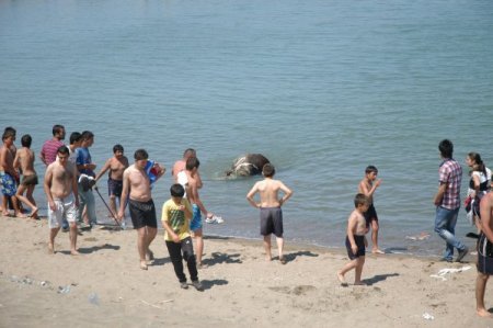 Yüzmek için sahile giden vatandaşlar denizde telef olmuş bir inek gördü. Kısa bir süre sonra karaya vuran inek vatandaşların yardımıyla sahil kenarına çekildi. Denize giren vatandaşların şaşkın bakışlar arasında inek kepçe yardımıyla sahilden uzaklaştırıldı.