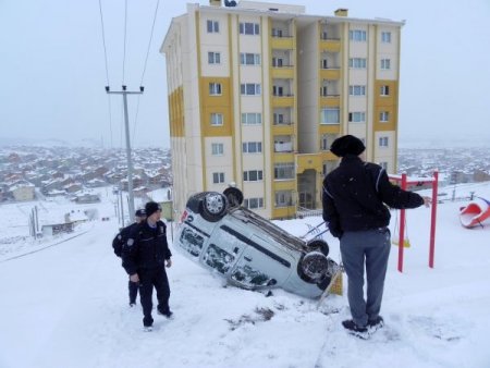 Kütahya’nın Tavşanlı ilçesinde sabah saatlerinde karda kayan otomobil, takla atarak çocuk parkına düştü.