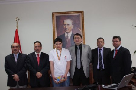 Palandöken Kaymakamı Şenol Esmer, 4-8 Mayıs tarihlerinde Romanya'da gerçekleşen 28. Balkan Matematik Olimpiyatı'nda ikinci olan ErzurumÖzel Aziziye Fen Lisesi 3. sınıf öğrencisi Yunus Emre Demirci’yi tebrik etti. Bugün İlçe Milli Eğitim Müdürü Ali Özer, Aziziye Koleji Fen ve Anadolu Lisesi Müdürü Mustafa Gürhan, İlköğretim Müdürü Hacı Aydın, Müdür yardımcısı Fatih Akaslan, Okulun Olimpiyat Koordinatörü Yüksel Demir ve Matematik Olimpiyat ikincisi Yunus Emre Demirci’yle Kaymakam Esmer’i ziyaret etti.