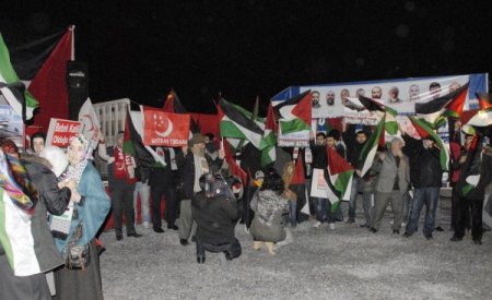 İsrail takımının yoğun güvenlik önlemleri giriş yaptığı salonun uzağında tutulan kalabalık, ellerindeki Türk ve Filistin bayraklarıyla 'İnsanlığın kurtulması için kahrolsun İsrail', 'Bebek katili olduğu için kahrolsun İsrail', 'Filistin için kahrolsun İsrail', '9 şehit için kahrolsun İsrail', 'Ümmedin iftiharı Furkan Doğan için kahrolsun İsrail', şeklinde sloganlar attı.