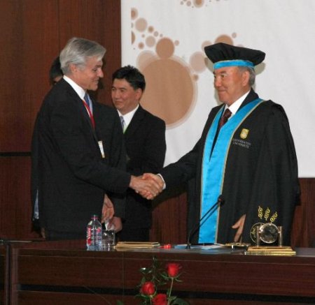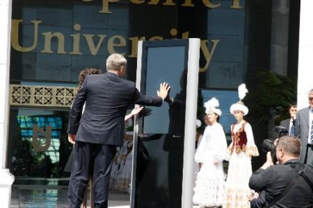 Açılışlarda gelenek haline gelen kurdele kesme yerine Nazarbayev, üniversite girişinde bulunan monitör ile açılışı gerçekleştirdi. Kazak lider daha sonra üniversite içerisinde kurulan 72 projenin maketini inceleyerek yetkililerden bilgi aldı. Cumhurbaşkanı Nazarbayev ardından üniversitede görev yapacak akademisyenlerle bir araya geldi. Burada Nazarbayev'e üniversitenin fahri doktora unvanı verildi.