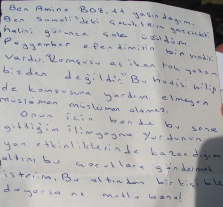 Kastamonu’da bir ilköğretim okulu öğrencisi, kazandığı altını Somali’ye gönderdi. Ali Fuat Darende İlköğretim Okulu öğrencisi Amine Boz, yaz etkinlikleri kapsamında İlim Yayma Cemiyeti’nde açılan Kur'an kursu bitiminde kendisine hediye edilen altın ödülünü Somali’ye gönderdi. CİHAN