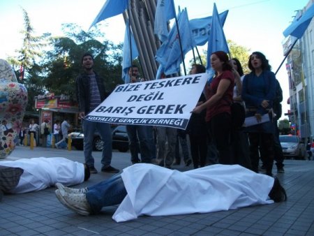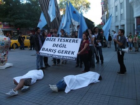 Sosyalist Gençlik Derneği üyesi bir grup genç, Galatasaray meydanında toplandı. ‘Bize Tezkere değil barış gerek’ yazılı pankart açan gruptan iki genç kefeni temsilen beyaz çarşafa dolanarak yere yattı. Grup adına bir basın açıklaması yapan Esra Öztürk, AK Parti Hükümetinin Ortadoğu’daki kirli oyunlara halkını kalkan yapmaya çalıştığını öne sürerek, “Hükümet bir yandan da Anadolu ve Mezopotomya topraklarını kan gölüne çevirmeye çalışıyor.” dedi.