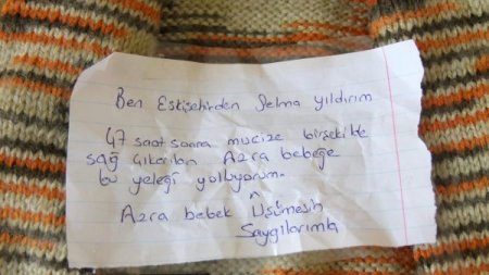 Yıldırım, Azra bebek için gönderdiği hırkanın üzerine bir de not yazmış. Notta, "Ben Eskişehir'den Selma Yıldırım. 47 saat sonra mucize şekilde enkaz altından sağ olarak çıkan Azra bebeğe bu hırkayı yolluyorum. Azra bebek üşümesin." ifadelerine yer verdi.