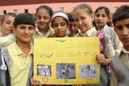Bu arada TOKİ İlköğretim Okulu öğrencileri depremden esinlenerek duygu ve düşüncelerini hazırladıkları dövize yansıttı. Öğrencilerin üzerinde “Gerçek güç sevgi ile gösterilir” dövizi dikkat çekti