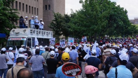 KESK üyelerinin terör örgütü KCK soruşturması kapsamında gözaltına alınmasını protesto etmek için sendika üyeleri Ankara Adliyesi önünde toplandı. ‘KESK’e dokunma’ dövizleri taşıyıp ‘İnadına sendika, inadına KESK’ sloganlı atan grup üyelerine BDP’li vekiller de destek verdi. KESK Genel Sekreteri İsmail Hakkı Tombul, burada yaptığı açıklamada sendika başkanı ve üyelerinin gözaltına alınmasını eleştirdi. Tombul, AK Parti’nin kendisi gibi düşünmeyen Kürtlerin siyaset yapmasına tahammül edemediğini öne sürdü. Gözaltına alınan zanlıların adliyedeki sorguları, KESK üyelerinin dışarıdaki bekleyişi devam ediyor.. CİHAN