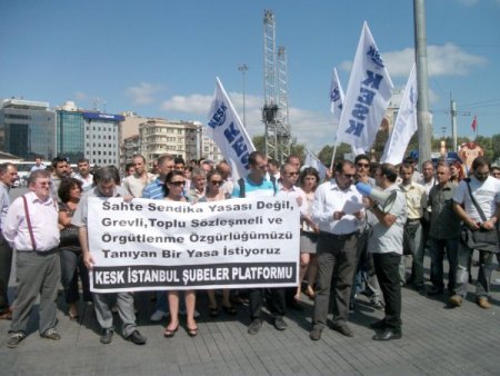 KESK İstanbul Şubeler Platformu üyesi yaklaşık 50 kişilik grup, Taksim meydanında toplandı. ‘Sahte sendika yasası değil grevli toplu sözleşmeli ve örgütlenme özgürlüğümüzü tanıyan bir yasa istiyoruz’ yazılı pankart açan grup adına basın açıklamasını KESK İstanbul Şubeler Platformu dönem sözcüsü Ersoy Adıgüzel yaptı.