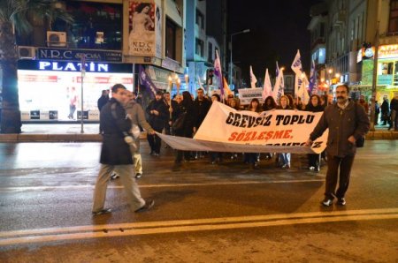 İzmir'in Konak Meydanı'nda biraraya gelen KESK'e bağlı sendika üyeleri, hükümet tarafından hazırlanan sendika yasası metnine tepki gösterdi. Konak'tan AK Parti İzmir İl Başkanlığı önüne kadar meşalelerle yürüyen yaklaşık 30 kişilik gruptan bazıları parti binası önünde ellerindeki dövizlerden birini ateşye verdi.
