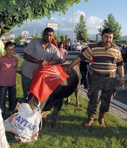 Bu arada, orta refüjde ağaçta bağlı boğa dikkat çekti. Üzerinde CHP bayrağı da bulunan boğa, Kılıçdaroğlu için hazırlanmıştı. Boğayı ise kasap olan sahibi Nuri Özmen kesmeye hazırlandı. Nuri Özmen, Kılıçdaroğlu'nun Kayseri'ye gelişi için bir iş adamının kendilerinden 4 bin lira ödeme yaparak boğa aldığını belirtti.