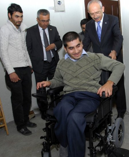 Cumhuriyet Halk Partisi (CHP) Genel Başkanı Kemal Kılıçdaroğlu, engelli Sinan Şemin'i evinde ziyaret ederek akülü tekerlekli sandalye hediye etti ve bayramını kutladı. Dün gece Dikmen'de bir gecekonduya misafir olan Kılıçdaroğlu, inşaat işçisi üç çocuk sahibi Mehmet Şemin'in 23 yaşındaki yürüme engelli çocuğu Sinan'a akülü tekerlekli sandalye hediye etti.