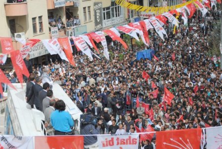 Cumhuriyet Halk Partisi (CHP) Genel Başkanı Kemal Kılıçdaroğlu, Hakkâri’de düzenlediği mitingde BDP’li belediye başkanlarına sahip çıktı. Kılıçdaroğlu, "Halkın seçtiği başkanı nasıl olur da siz ellerini kelepçeleyip resim çektiriyorsunuz?" diye sordu.