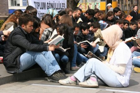 Trabzon’da bir grup genç okumanın önemine dikkat çekmek için şehir merkezinde açık alanda kitap okudu. Kültür Bakanlığı, bu yıl Kütüphane Haftası'nın ilk günü kitap okuma kültürünü geliştirmek amacıyla 81 ilin şehir meydanında, aynı saatte, açık havada kitap okuma kampanyası düzenledi. 'Kitabını alan gelsin, şehir merkezinde kitap okuyoruz' sloganıyla Kütüphaneciler Derneği'nin desteği ile başlatılan etkinlik kapsamında Trabzon’da da bir grup genç, açık alanda kitap okudu. Meydan Parkı’nda toplanan Karadeniz Teknik Üniversitesi (KTÜ) Toplum Gönüllüleri üyesi bir grup öğrenci, yere oturarak yarım saat süreyle kitap okudu. Gençlerin ne yaptığını anlamaya çalışan bazı vatandaşların ise onları seyretmesi dikkat çekti.