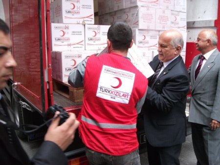 Ardından yardım malzemeleri kamyondan indirilerek Kilise’ye teslim edildi. Kızılay Başkanı Akar’da kolilerin taşınmasına yardım etti.