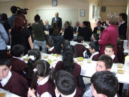 Kızılay heyeti yardım malzemelerinin tesliminden önce öğrencilerle ‘sevgi yemeği’nde bir araya geldi. Vakıf Başkanı Monik Ergan, Kızılay Başkanı Akar’a yardımlarından ötürü teşekkür plaketi ve torunun harçlıklarından biriktirdiği paraların bulunduğu Kızılay kumbarasını verdi.