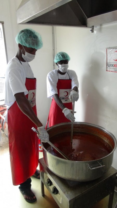 Geçtiğimiz yıldan bu yana Somali’de ofisi ve ekibi bulunan Türk Kızılayı, Mogadişu’da oluşturduğu mobil mutfakta her gün 10 bin Somaliliye sıcak yemek dağıtıyor. Öncelikli olarak yetimhaneler, okullar ve engellilerin yaşadığı kamplara dağıtılan yemek, göz hakkı olarak civarda yaşayan ihtiyaç sahibi ve engellilerin yaşadığı 400 ailenin evlerine de ulaştırılıyor.