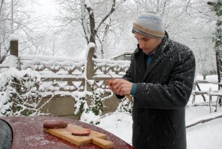 Kocaeli’nin yüksek kesimleri beyaza büründü. Kar kalınlığının 10 santime ulaştığı bölgede, tatilciler kar altında sucuk pişirdi.