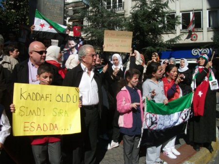 Suriye ile Dayanışma Platformu üyesi Türk ve Araplardan oluşan yaklaşık yüz kişilik grup, Suriye’de yaşanan olayları protesto etmek için Teşvikiye’de bulunan konsolosluk binası önünde toplandı. Arapça sloganlar atan grup ‘Kaddafi öldü sıra Esad’da’ , ’15 gün çocuklarımızı öldürmek için yeterli bir mühledir’ , ‘Suriye halkı Hakkari’deki 24 şehit için ağlıyor. Şehitlerimize Allah’tan rahmet yakınlarına baş sağlığı diliyoruz’ yazılı dövizler ve pankartlar taşıdı.