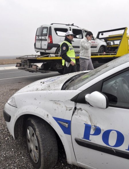 Kaza şokunu üzerinden atlatan polis memuru sol ön tarafından hasar gören aracının fotoğrafını çekerek tutanağını hazırladı. CİHAN