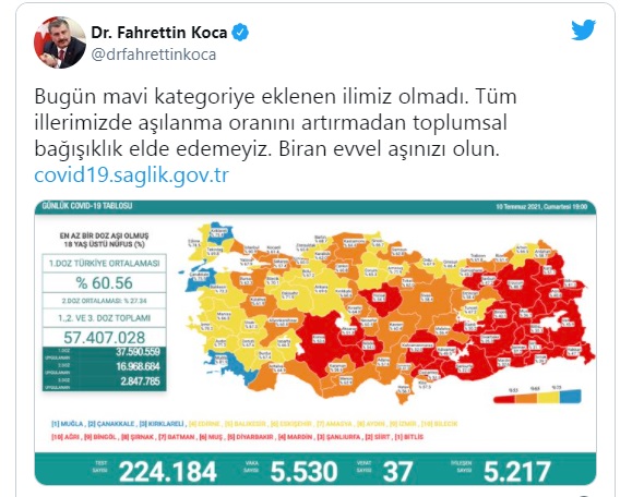 Günlük tabloyu paylaşan Sağlık Bakanı Fahrettin Koca da bugün mavi kategoriye eklenen il olmadığına dikkati çekerek, "Tüm illerimizde aşılanma oranını artırmadan toplumsal bağışıklık elde edemeyiz. Bir an evvel aşınızı olun." açıklamasında bulundu.