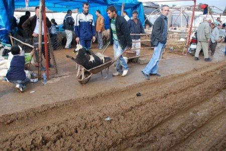Hatay’ın İskenderun ilçesinde kurulan kurban pazarının bataklığa dönüşmesi yüzünden vatandaşların kurbanlık pazarlığı adeta çileye dönüştü. Üç günden bu yana İskenderun’da devam eden yağışlar nedeniyle çamur içinde kalan kurban pazarına araçlar giremedi. Bu yüzden pazardan aldıkları hayvanları bir kilometre çamurlu yolu yürüyerek götürmek zorunda kalan vatandaşlar ilginç yöntemlere başvurdu. Aldıkları kurbanlıkları pazardan çıkarmak için seyyar el arabası ve sepetli motosiklet kullanmak zorunda kalan vatandaşlar büyük güçlükler yaşadı.