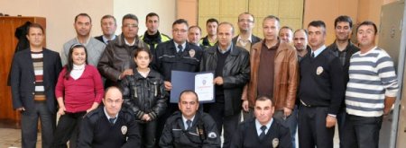 Konuşmaların ardından İl Emniyet Müdürü Kadir Akbıyık polis memuru Erdal Vural’a başarı belgesiyle küçük altın vererek hatıra fotoğrafı çektirdi. CİHAN