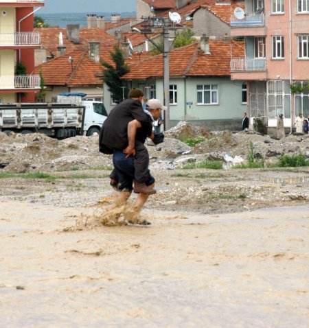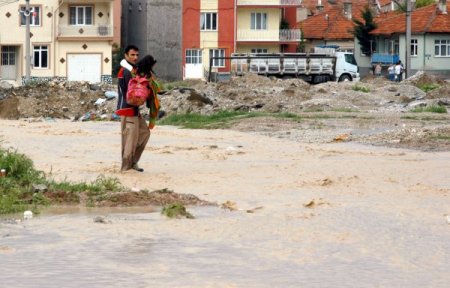 Ortaöğretim öğrencilerinin okul çıkış saatinin bitiminde kesilen yağmur nedeniyle evlerine gitmek üzere okullarından çıkan öğrenciler, yolların su bulunan ölümlerinden yakınları tarafından kucakta ve sırtlarında taşınarak karşıya geçirildi.