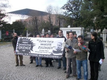Barış için Vicdani Ret Platformu ve Mazlumder üyesi bir grup Kasımpaşa’da bulunan Kuzey Deniz Saha Komutanlığı önünde toplandı. Çevik kuvvetin yanı sıra askerlerin de güvenlik önlemi aldığı eylemde grup, ‘Askeri cezaevlerinde işkence var. Zulme karşı sessizlik zulümdür. Vicdani retçi Muhammed Serdar Delice’ yazılı pankart açtı.