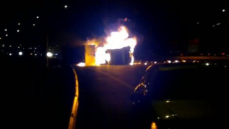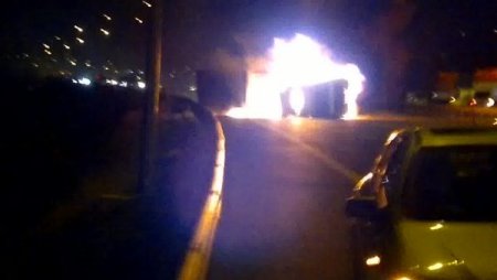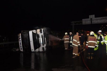 Kaza, dün saat 21.00 sıralarında, Bornova- Karşıyaka çevre yolu Osmangazi Viyadüğü'nde meydana geldi. Aliğa'da, 20 V 7488 plakalı TIR'a hayvan yemi yükleyen evli ve 2 çocuk babası Yüksel Ateş, yükünü Denizli'ye götürmek için yola çıktı. Bornova - Karşıyaka çevre yoluna geldiği sırada rampa aşağı inen TIR'ın sağ ön tekeri patladı. Sürücü Ateş'in direksiyon hakimiyetini kaybetmesi sonucu TIR yaklaşık 50 metre sürüklendikten sonra durabildi. Hayvan yemleri yola saçıldı ve araç alev alarak yanmaya başladı. Yoldan geçen sürücüler, yaralı Ateş'i araçtan kurtardı. Kolundan yaralanan Ateş, Ege Üniversitesi Hastanesi'ne kaldırılarak tedavi altına alındı. Ateş'in sağlık durumunun iyi olduğu öğrenildi.