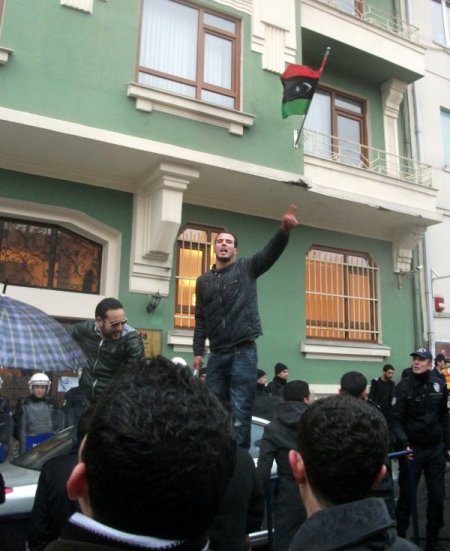 Yoğun yağmur altında marşlar söyleyerek dans eden Libyalılar uzun süre slogan attı. Bariyerlerin üzerine çıkan bazı Libyalılar güçlükle aşağı indirildi. Konsolosluk kapısı önünde önlem alan çevik kuvvet ekipleri müdahale için hazırlık yaptığı sırada bir konsolosluk yetkilisi dışarı çıkarak grupla görüştü. Grubu temsilen bir kişiyi içeri alan Libyalı yetkililer, maaşların şu an için ödenmesinin söz konusu olmadığını ancak Libya hükümeti ile görüştükten sonra bir açıklamanın yapılacağı bilgisini verdi.