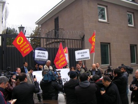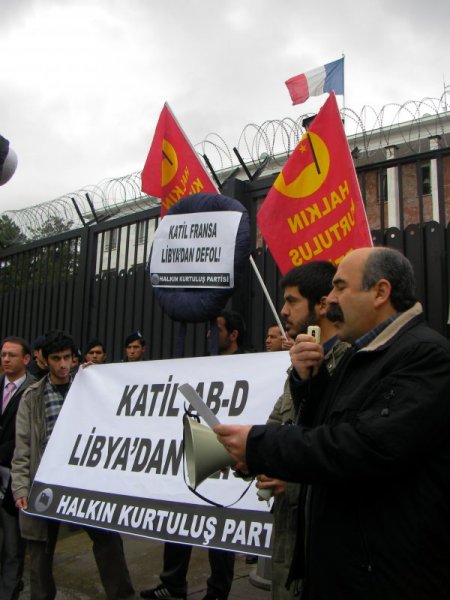 Başkent’te Halkın Kurtuluş Partisi (HKP) üyesi bir grup, Fransa ve ABD Büyükelçiliği önünde Libya’ya yapılan askeri müdahaleyi protesto etti. HKP üyesi grup, ticari taksilerle Paris Caddesi üzerinde bulunan Fransa’nın Ankara Büyükelçiliği önüne geldi. “Libya halkı yalnız değildir” sloganları atan grup, “Katil AB-D Libya’dan defol”, “Katil Fransa Libya’dan defol” dövizleri taşıdı. Grup adına konuşan HKP Genel Sekreter Yardımcısı avukat Sait Kıran, gerçekleştirilen saldırının nedeninin Libya’da kolay ve ucuza rafine edilebilen petrol olduğunu söyledi. Kıran, bölgedeki Arap halkının yükselişisin bu saldırılarla engellenemeyeceğini söyledi. HKP üyeleri daha sonra elçilik önüne siyah çelenk bıraktı. Grup buradaki açıklamanın ardından sloganlar eşliğinde ABD’nin Ankara Büyükelçiliği’ne yürüdü. Yoğun güvenlik önlemleri altında gerçekleşen eylem, burada okunan aynı açıklamanın ardından son buldu. Grup olaysız bir şekilde dağıldı.