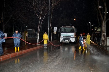 Açıklamada, şehir merkezindeki cadde ve sokakların gündüz saatlerinden itibaren arazözlerden tazyikli su verilerek yıkanmaya başlandığı belirtildi. Yıkama çalışmalarının gece saatlerinde de 6 adet arazöz ve 20 personel ile daha yoğun bir şekilde yapıldığı belirtilen açıklamada, yolların ve kaldırımların hortum kullanılarak tazyikli su ile yıkandığı, çalışmaların belli aralıklarla devam edeceği ifade edildi.